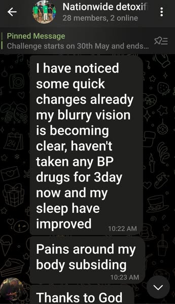 " It feels good already, I have noticed some quick changes already. My blurry vision is becoming clear, haven't taken any BP drugs for 3days now and my sleep has improved.