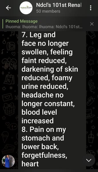 7. Leg and face no longer swollen, feeling faint reduced, darkening of skin reduced, foamy urine reduced, headache no longer constant, blood level increased