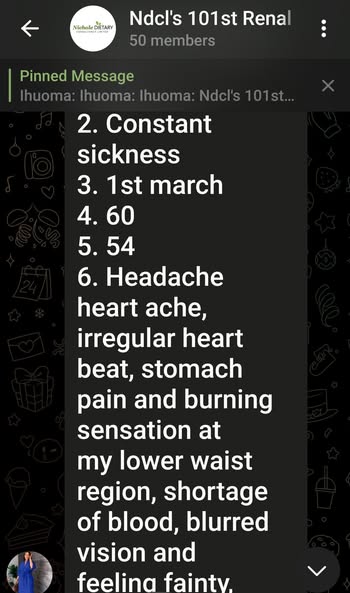 6. Headache heart ache, irregular heart beat, stomach pain and burning sensation at my lower waist region, shortage of blood, blurred vision and feeling fainty, most atimes it will be as if am paralysing from my leg radiating to my head and eye, heart palpitations, different stomach and heart disturbances, stomach mass, feverish feeling, darkening of skin and lost of weight, puffy face atimes and leg but reduced, forgetfulness, foamy urine