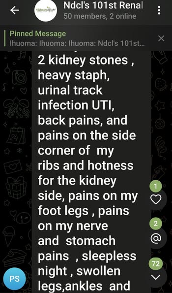 2 kidney stones , heavy staph, urinal track infection UTI, back pains, and pains on the side corner of my ribs and hotness for the kidney side, pains on my foot legs , pains on my nerve and stomach pains , sleepless night , swollen legs,ankles and hands, waist pain, my period can come out at any date ,