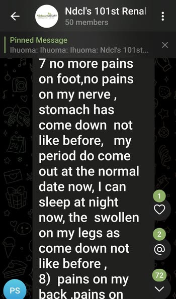 7 no more pains on foot,no pains on my nerve , stomach has come down not like before, my period do come out at the normal date now, I can sleep at night now, the swollen on my legs as come down not like before ,