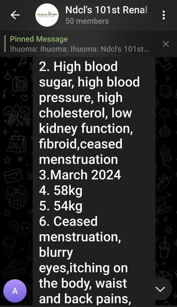 2. High blood sugar, high blood pressure, high cholesterol, low kidney function, fibroid,ceased menstruation
