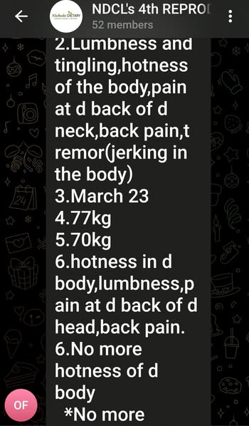 2.Lumbness and tingling,hotness of the body,pain at d back of d neck,back pain,tremor(jerking in the body)
