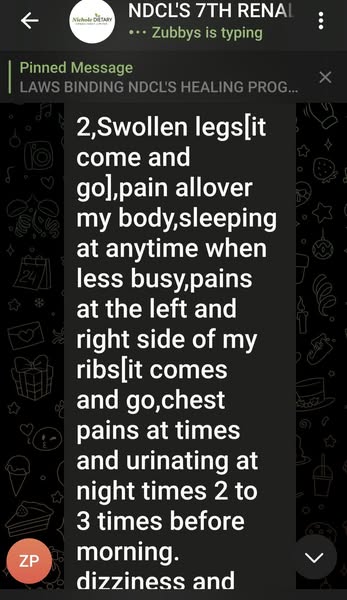 2. Swollen legs [it come and go], pain all over my body, sleeping at anytime when less busy, pains at the left and right side of my ribs [it comes and go, chest pains at times and urinating at night times 2 to 3 times before morning.