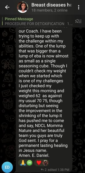 I joined this challenge though I didn't fully know how it would be but I had faith for one thing, TO dissolve the lumps on my breasts. Even when all the required items were not fully on ground, I took a leap of faith and started and completed the things from morning rituals to walkouts to daily smoothies to night rituals, I tried to observe all. Along the line even now I had a distressing situation which I informed our Coach. I have been trying to keep up with the challenge within my abilities. One of the lump that was bigger than a lump of eba is now almost as small as a single seasoning cube. Though I couldn't check my weight when we started which is one of my challenges I just checked my weight this morning and weighed 62 as against my usual 70 75, though disturbing but seeing the improvement in the shrinking of the lump it has pushed me to come and say, NDCL Momma Nature and her beautiful team you guys are truly God sent. I pray for a permanent lasting healing in Jesus name.