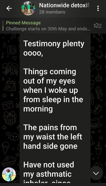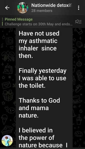 I believed in the power of nature because I embarked on this same journey January this year for 30 days, l saw the positive signs. Am not regretting joining this particular one as a group. I have really learnt a lot on this program. I stop by saying, the day you stop learning, you start dying. May God Almighty help us to achieve our goals here, and also continue with this life style and not to go back on our vomit "