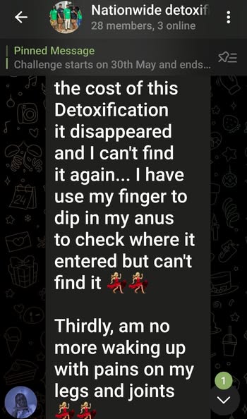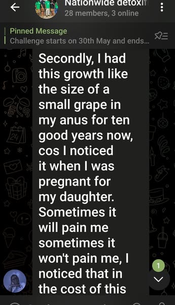 Secondly, I had this growth like the size of a small grape in my anus for ten good years now, cos I noticed it when I was pregnant for my daughter. Sometimes it will pain me sometimes it won't pain me, I noticed that in the cost of this Detoxification it disappeared and I can't find it again... I have use my finger to dip in my anus to check where it entered but can't find it
