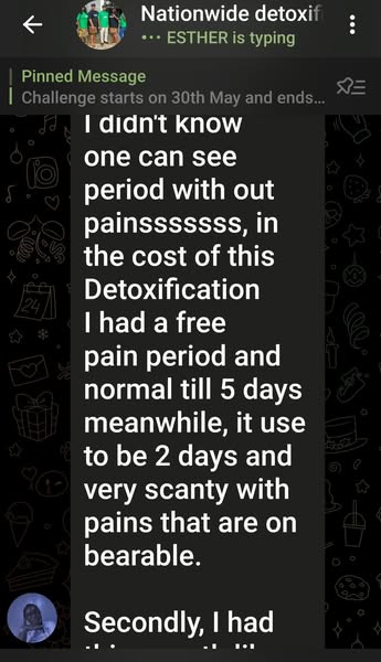 I didn't know one can see period with out painsssssss, in the cost of this Detoxification I had a free pain period and normal till 5 days meanwhile, it use to be 2 days and very scanty with pains that are on bearable.