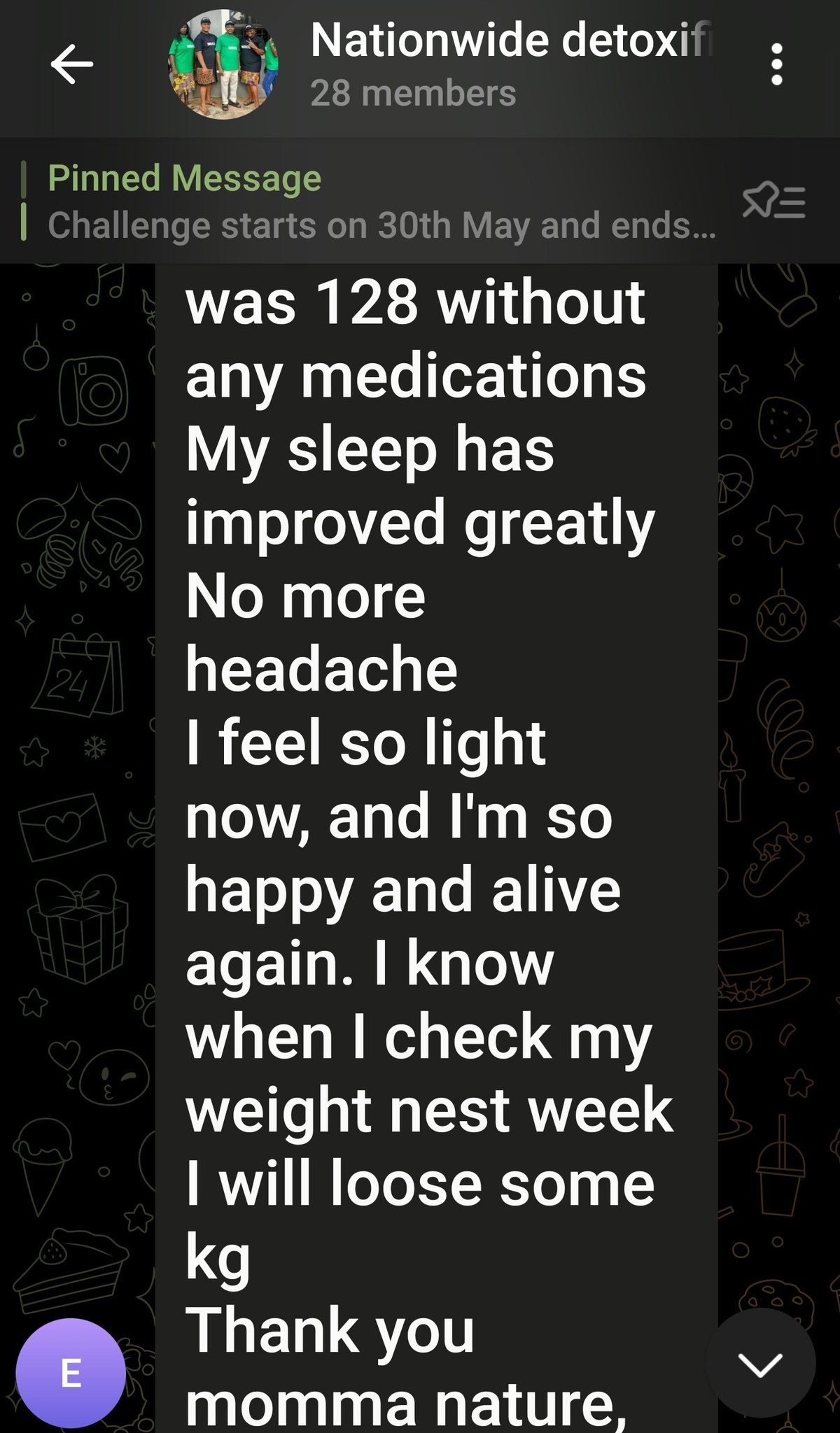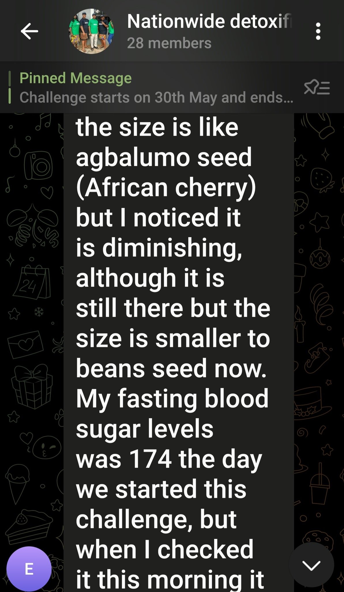 My fasting blood sugar levels was 174 the day we started this challenge, but when I checked it this morning it was 128 without any medications